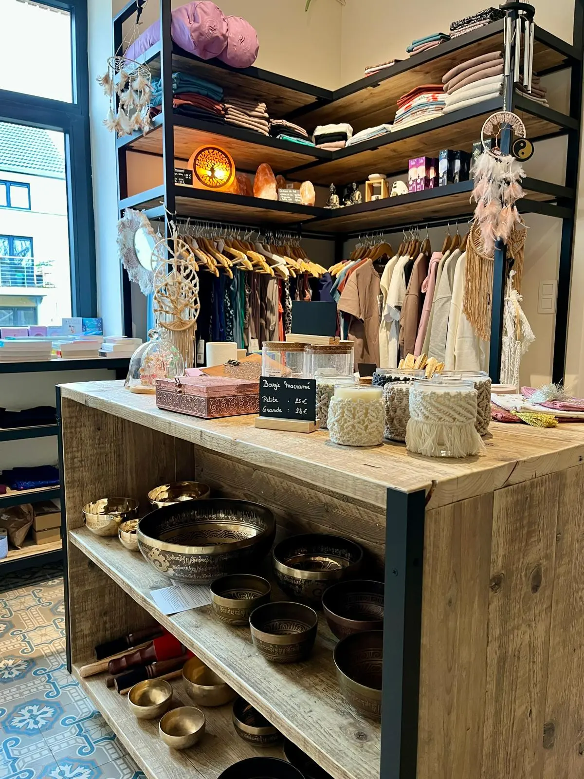 Vêtements de yoga & de sport écoresponsables, livres, oracles, pierres, carillons, bols chantants… Mais aussi des créations artisanales locales : pralines, tisanes, savons, bougies…